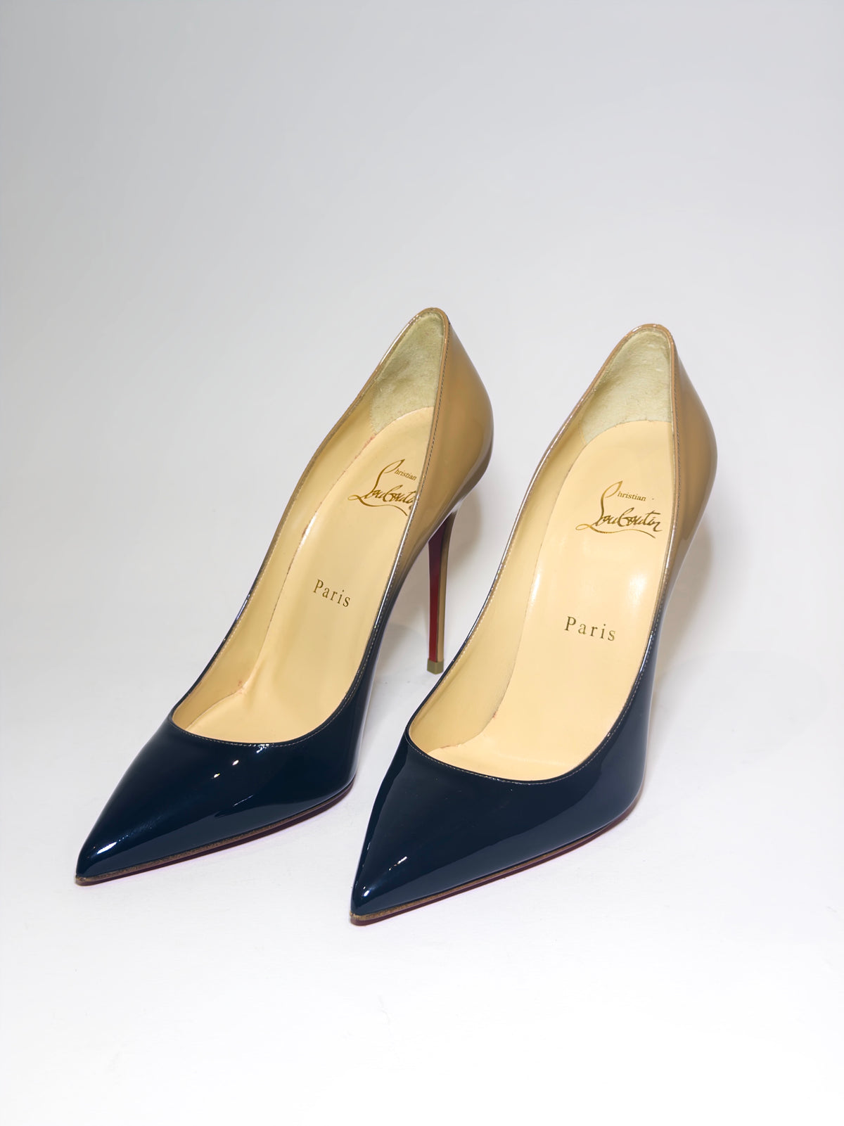 Pointed-toe pumps with two-tone design in glossy beige and black patent leather.