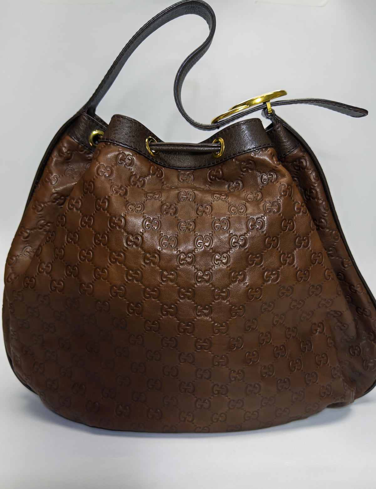 Two-toned brown leather bag with iconic GG pattern and interlocking buckle on shoulder strap. Drawstring closure.