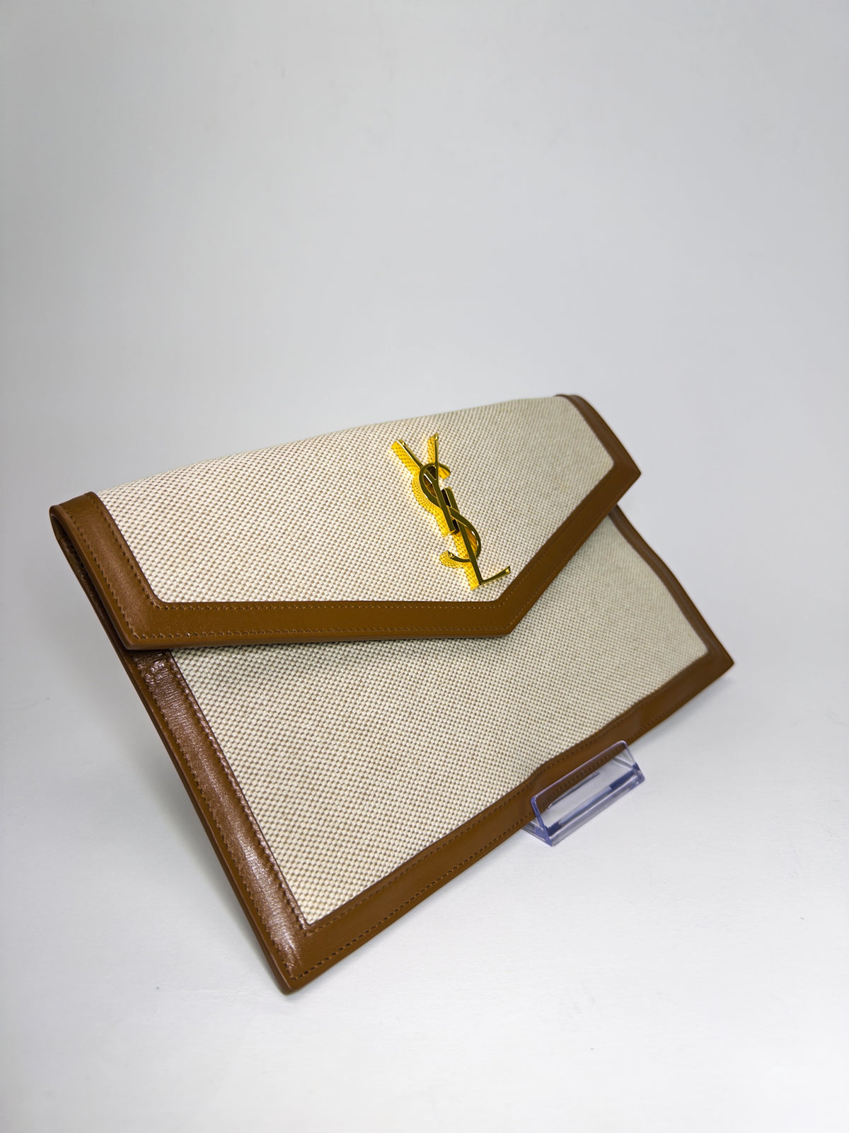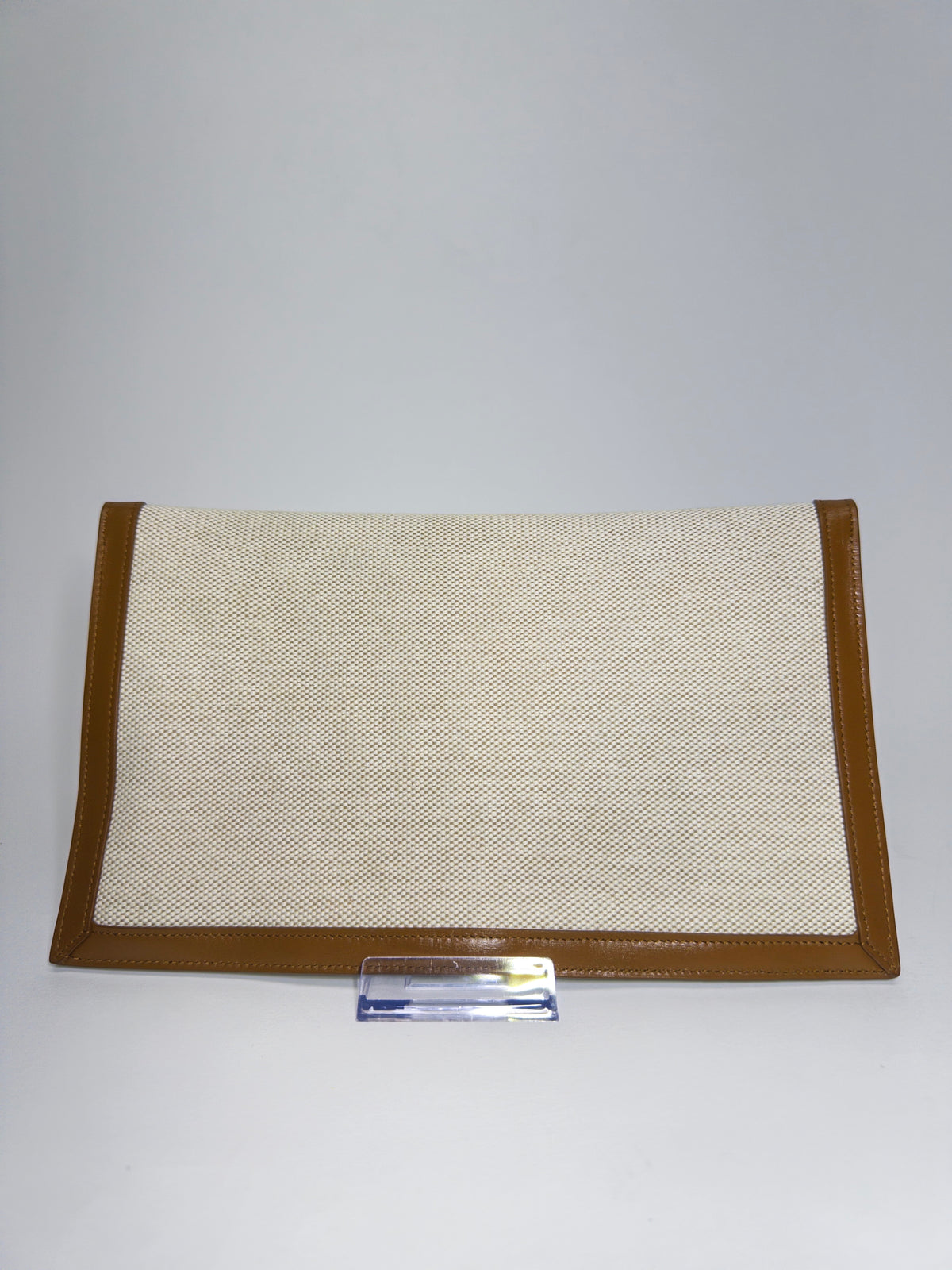 Canvas clutch with brown leather trim and gold-toned logo hardware.