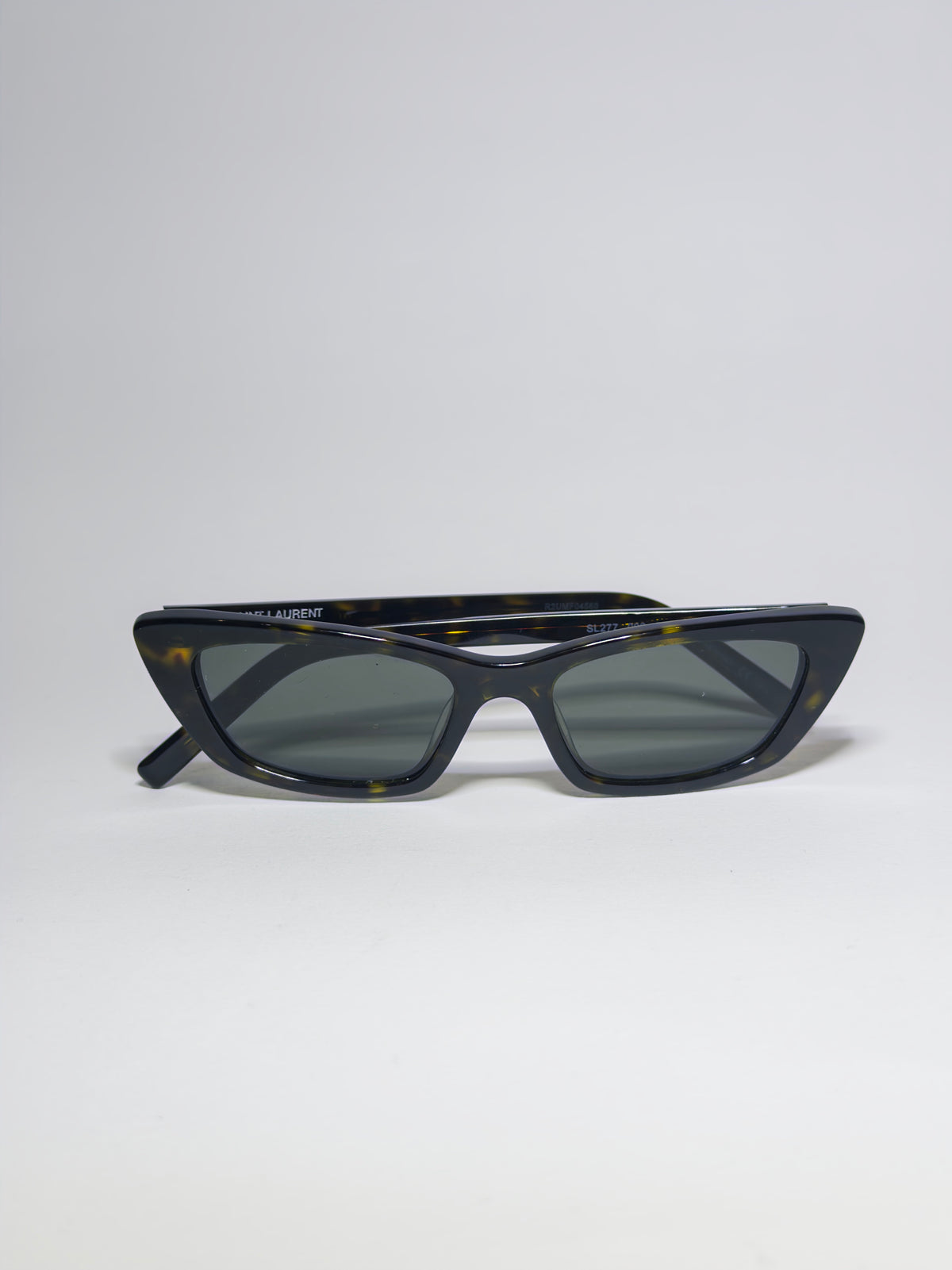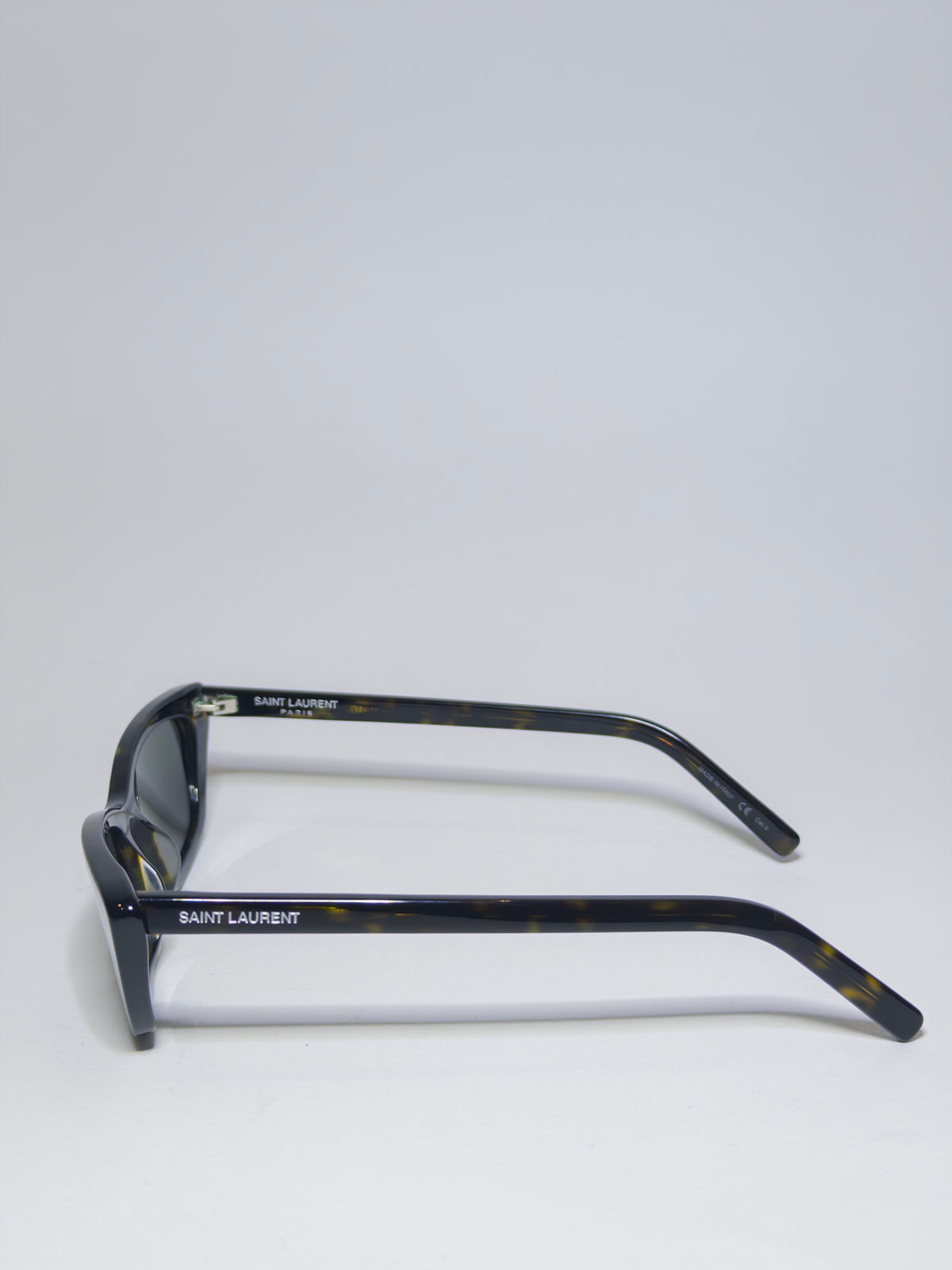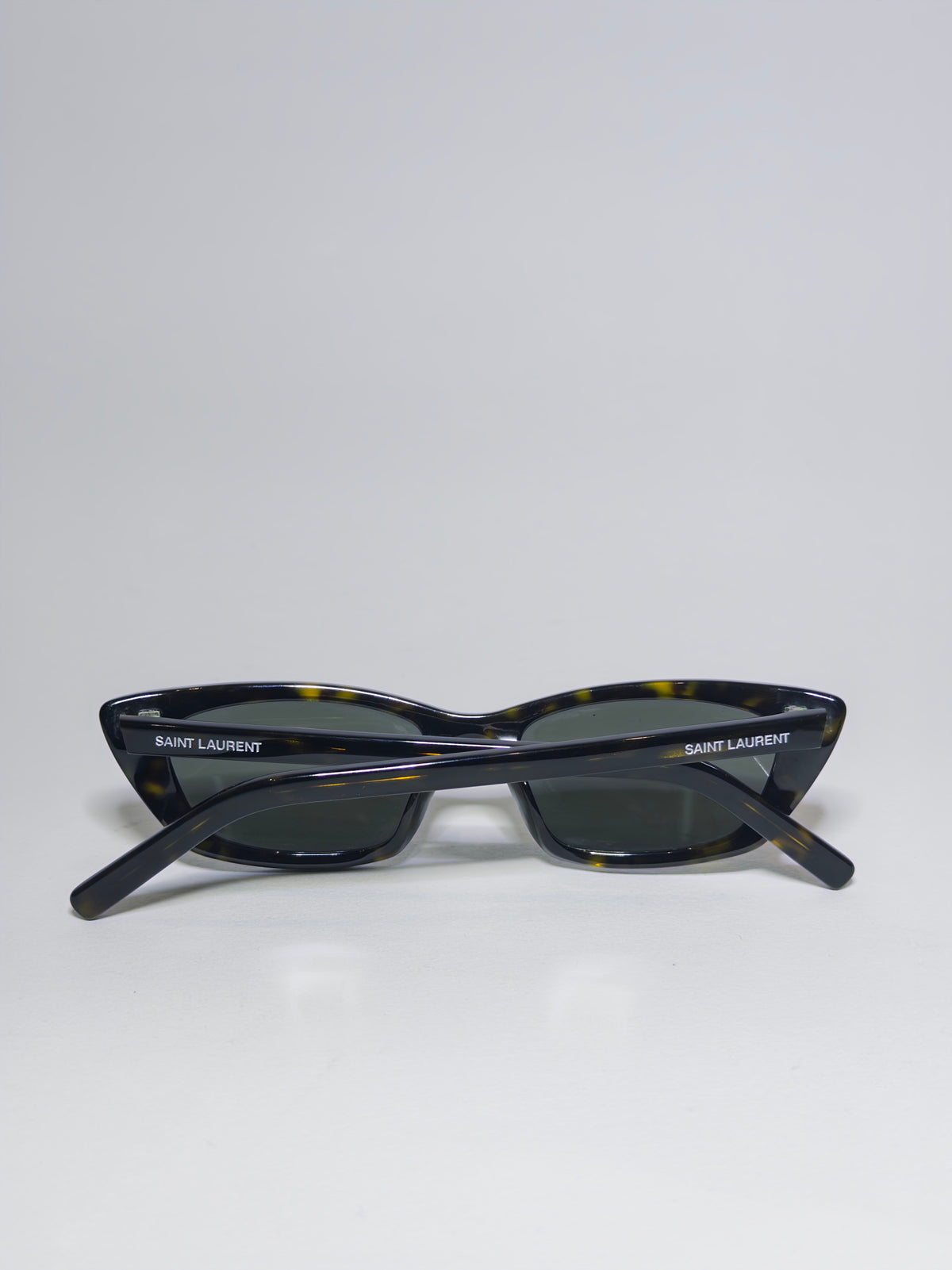 Cat-eye sunglasses with black frames and dark tinted lenses. Features Saint Laurent logo detailing on the temples. Comes with case.