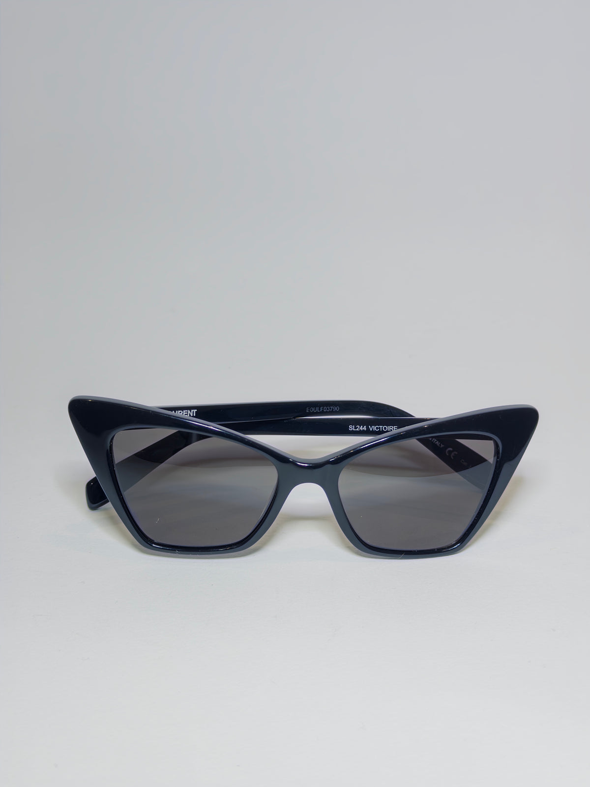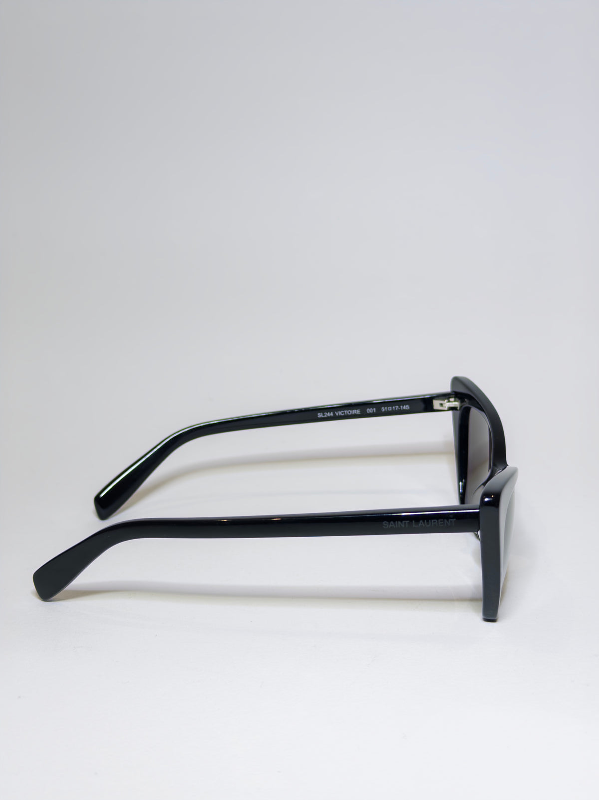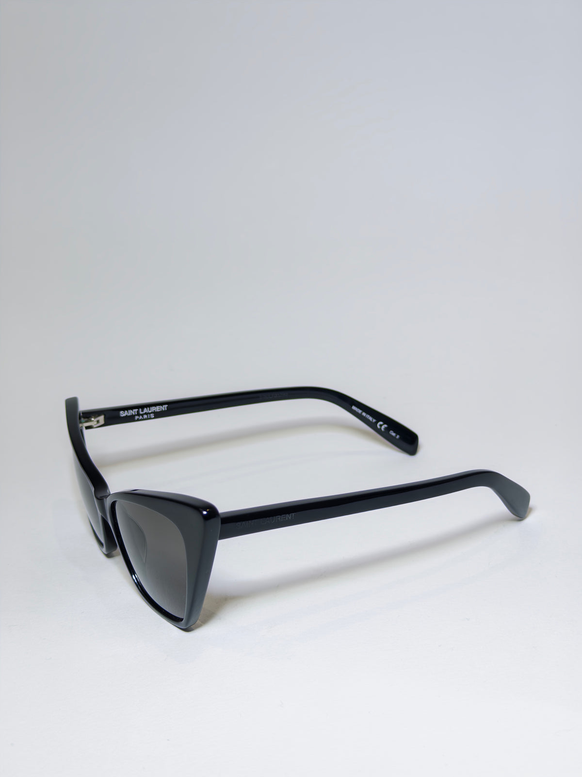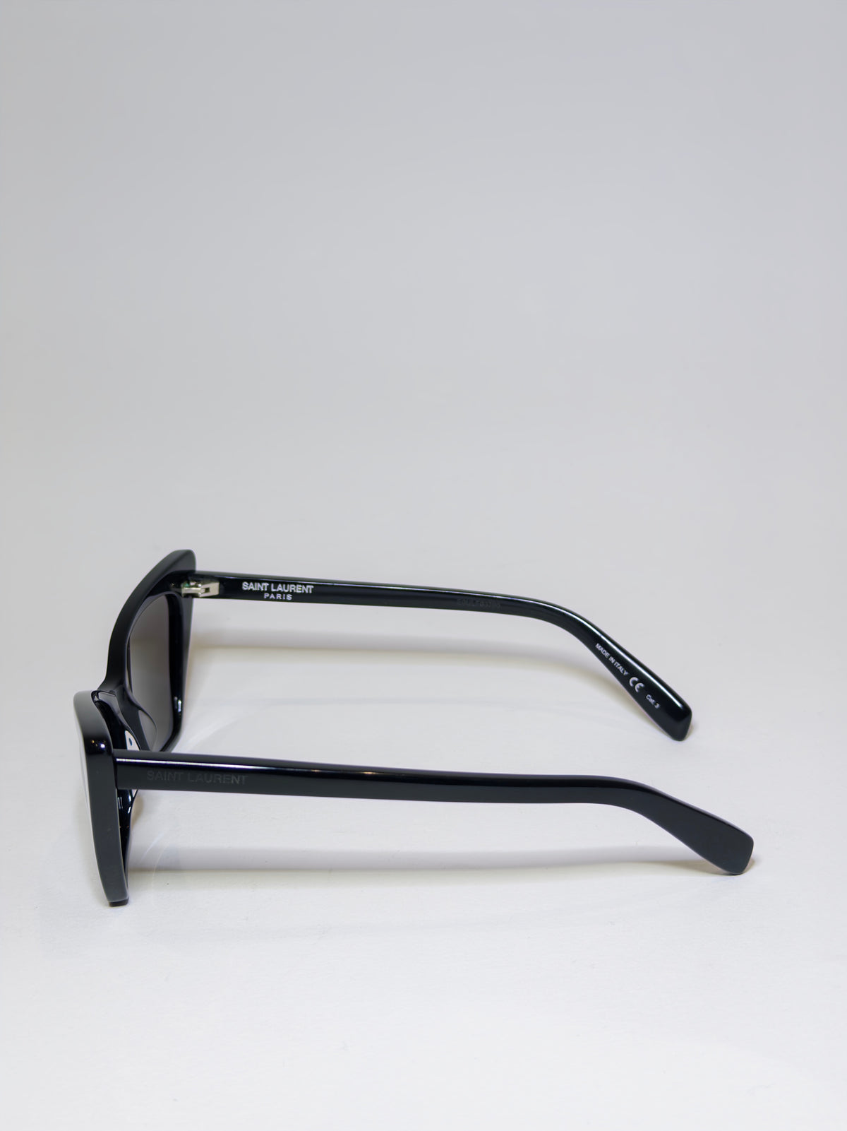 Square cat-eye sunglasses with black frames and dark tinted lenses. Features the Saint Laurent logo on the temples.