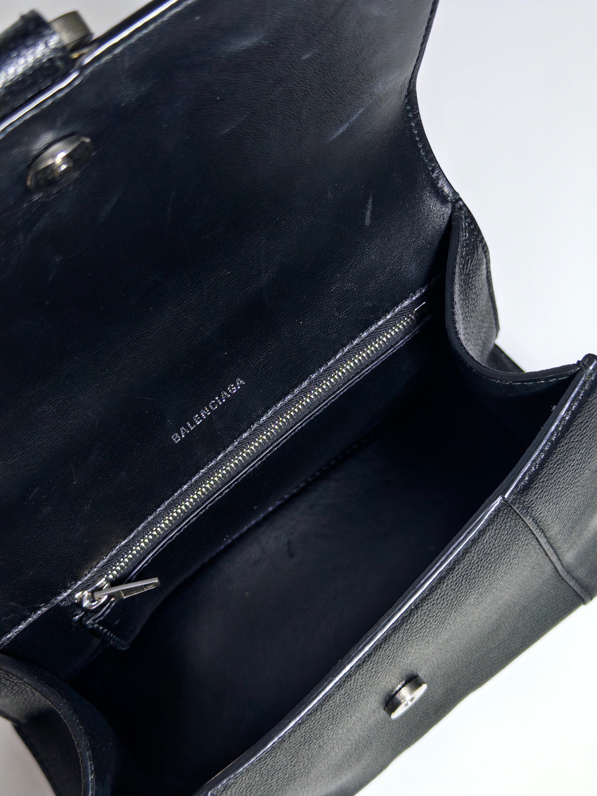 Black leather bag signature 'B' logo in silver tone, rounded top handle, detachable and adjustable shoulder strap.