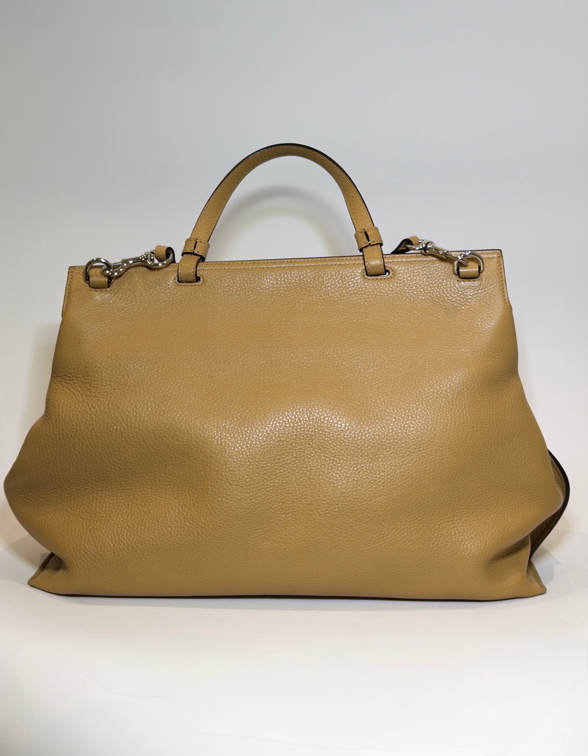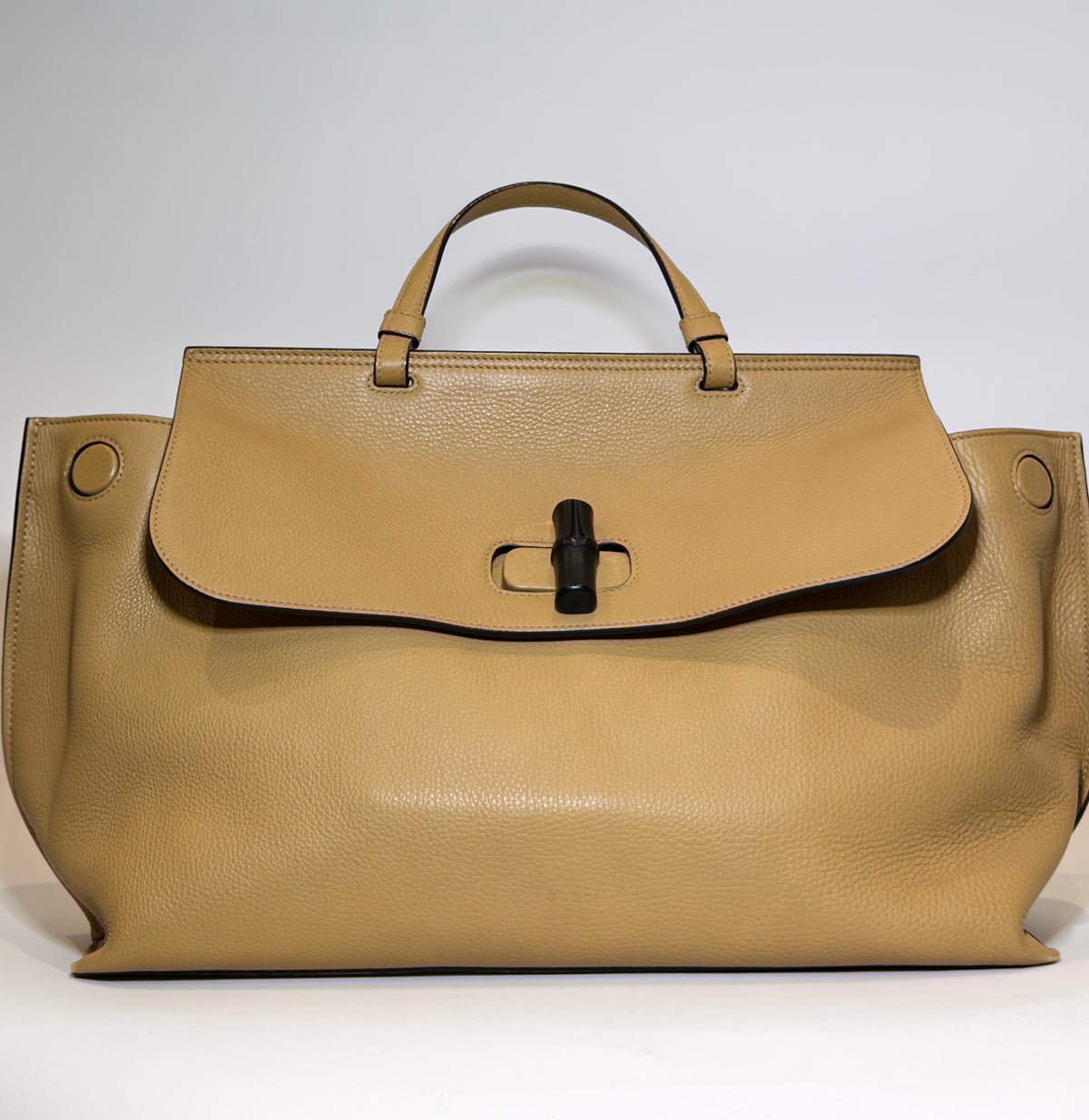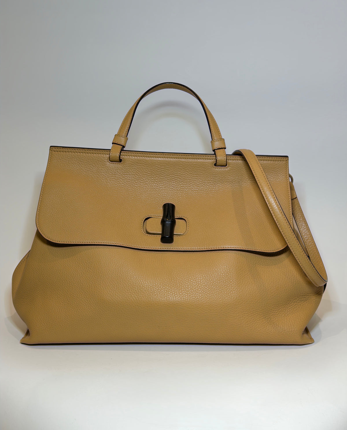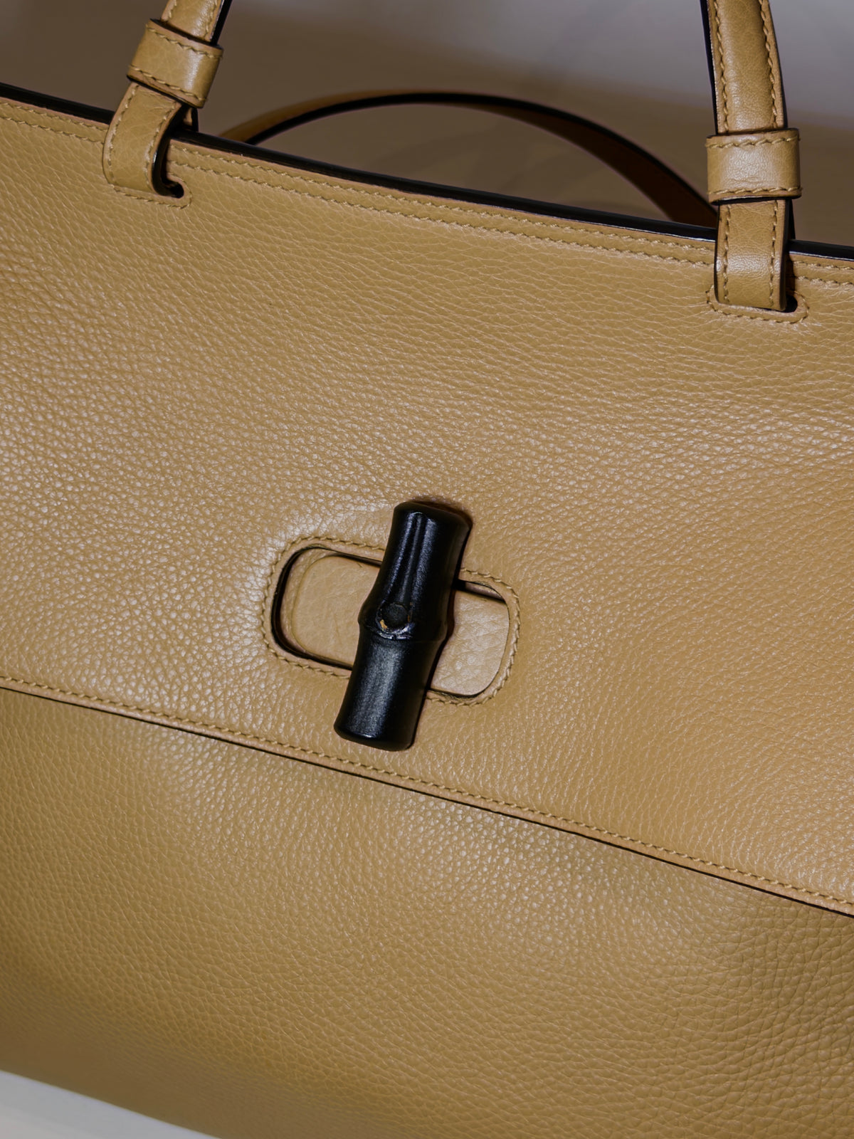 Beige leather top-handle bag with signature bamboo turn-lock closure, single top handle, and an adjustable shoulder strap.