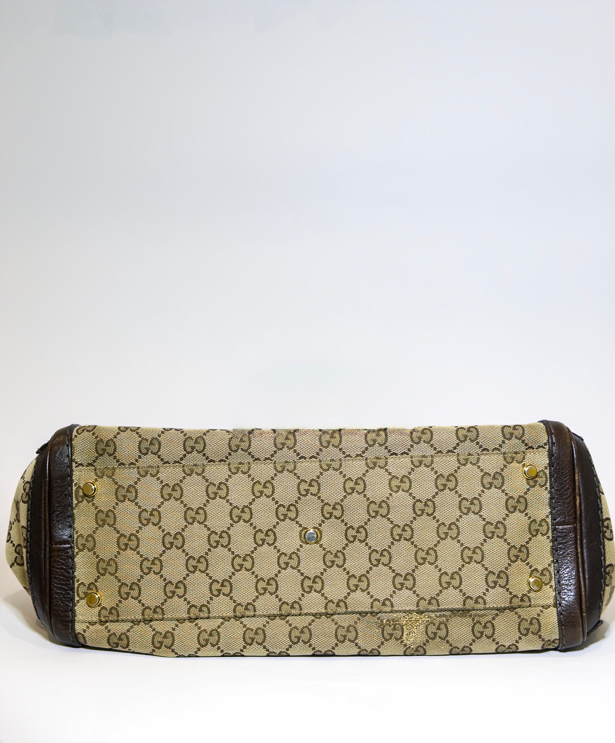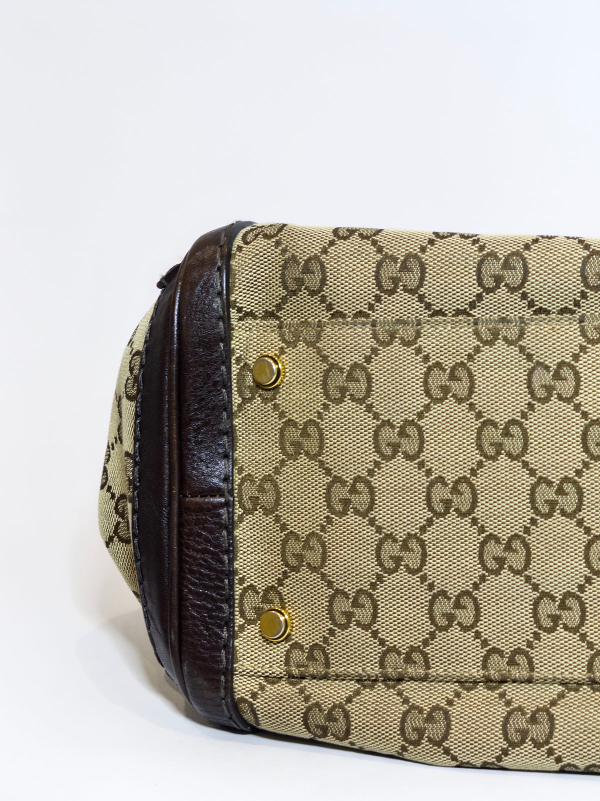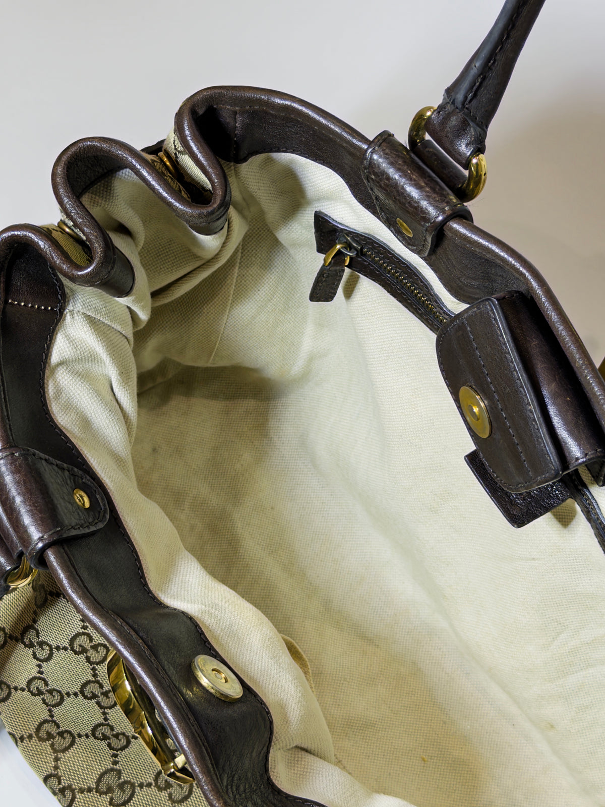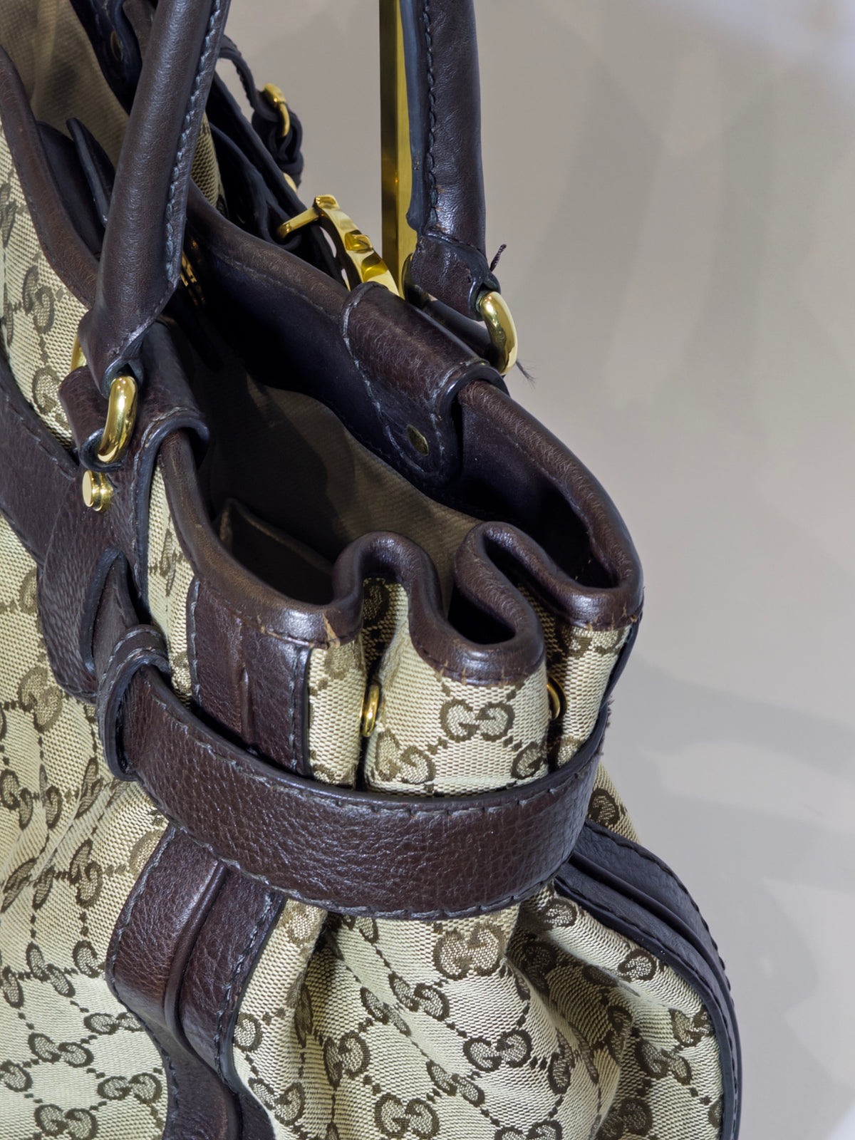 Vintage Gucci canvas and leather bag with monogram short shoulder strap tote and gold hardware.