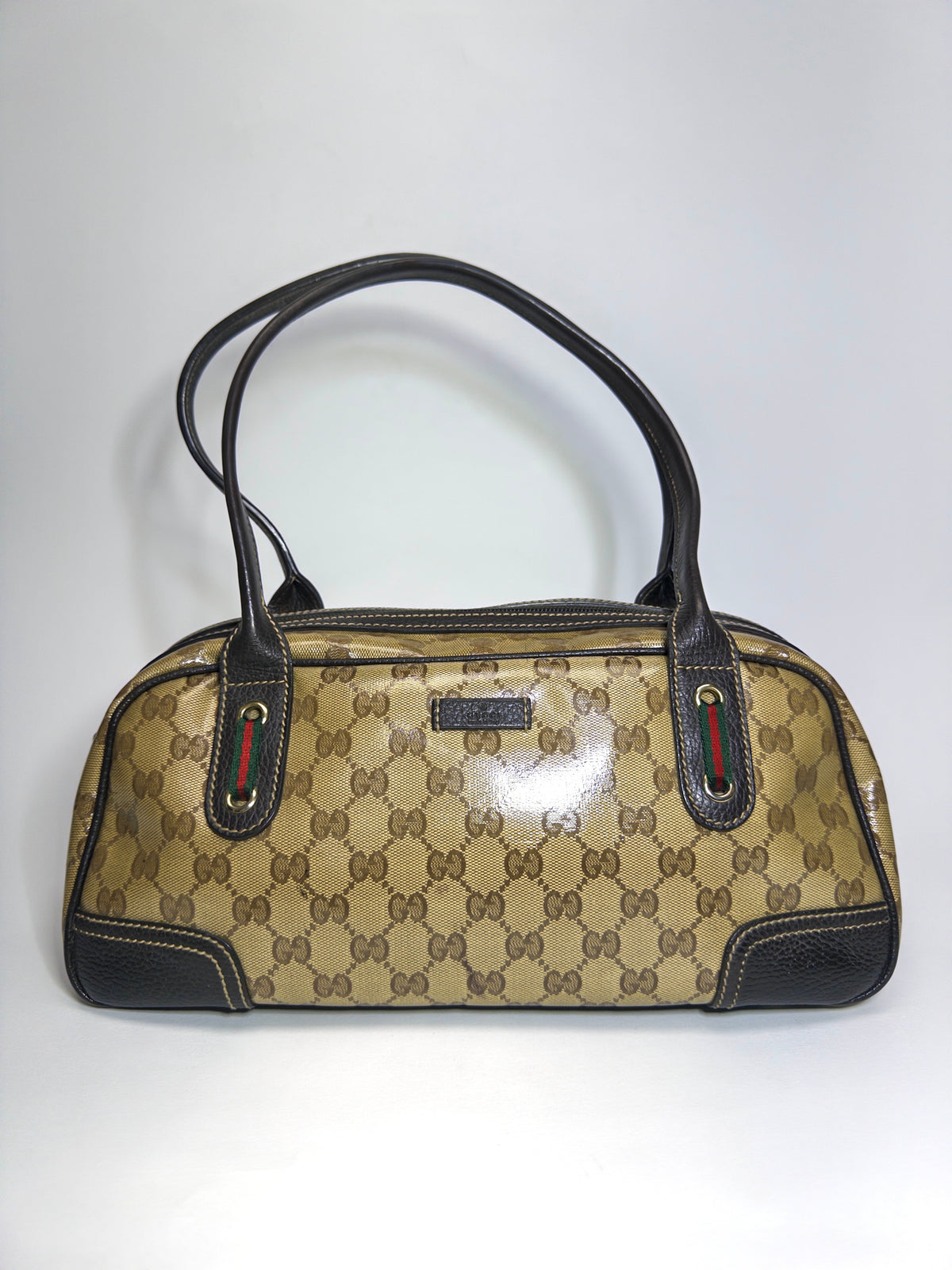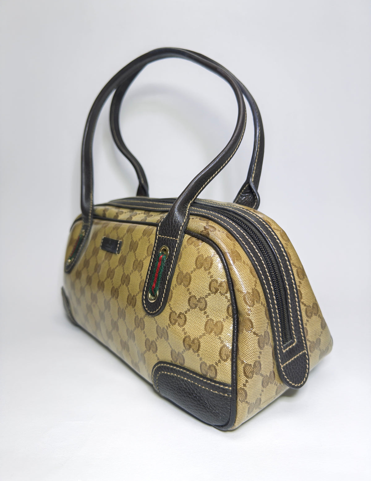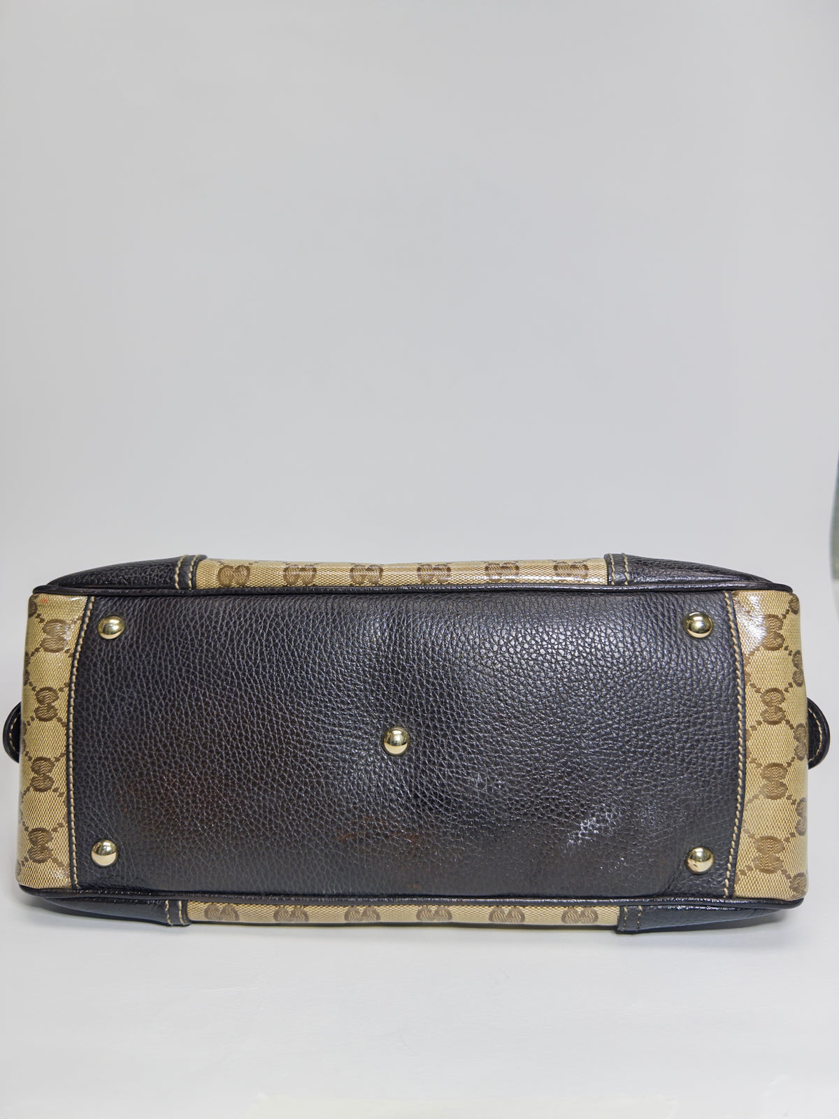 GG Crystal canvas bag with brown leather trims and signature web details.