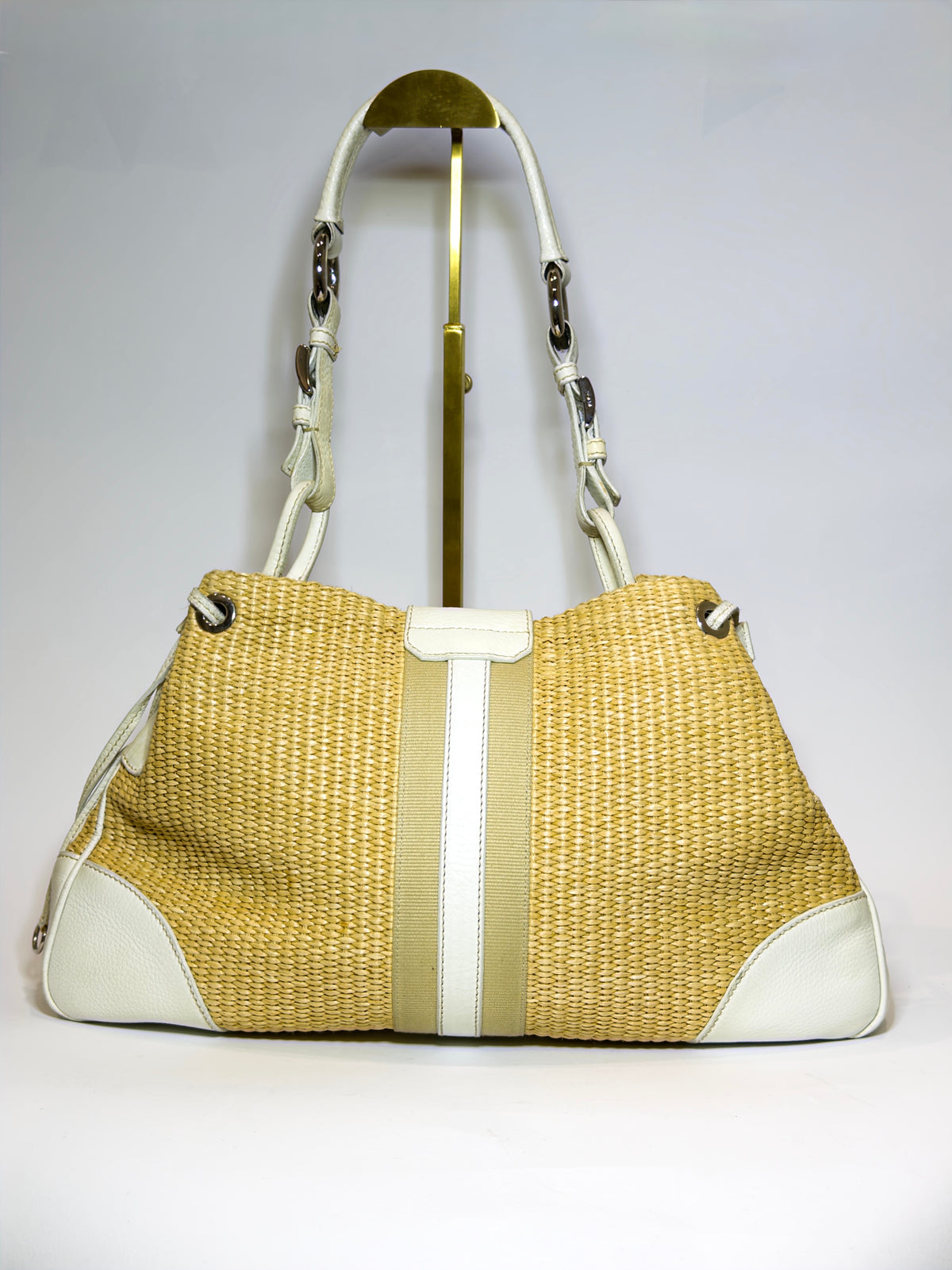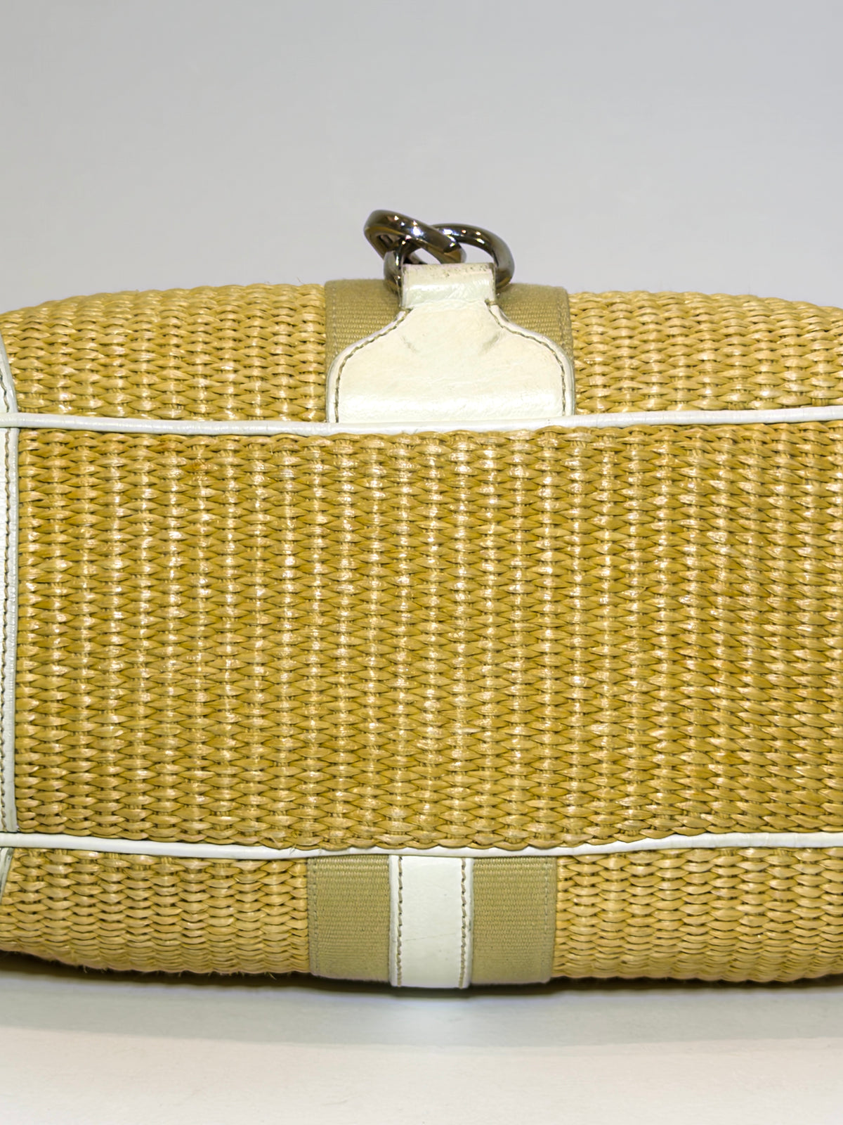 Beige raffia and white leather with string and buckle closure, adjustable shoulder strap.