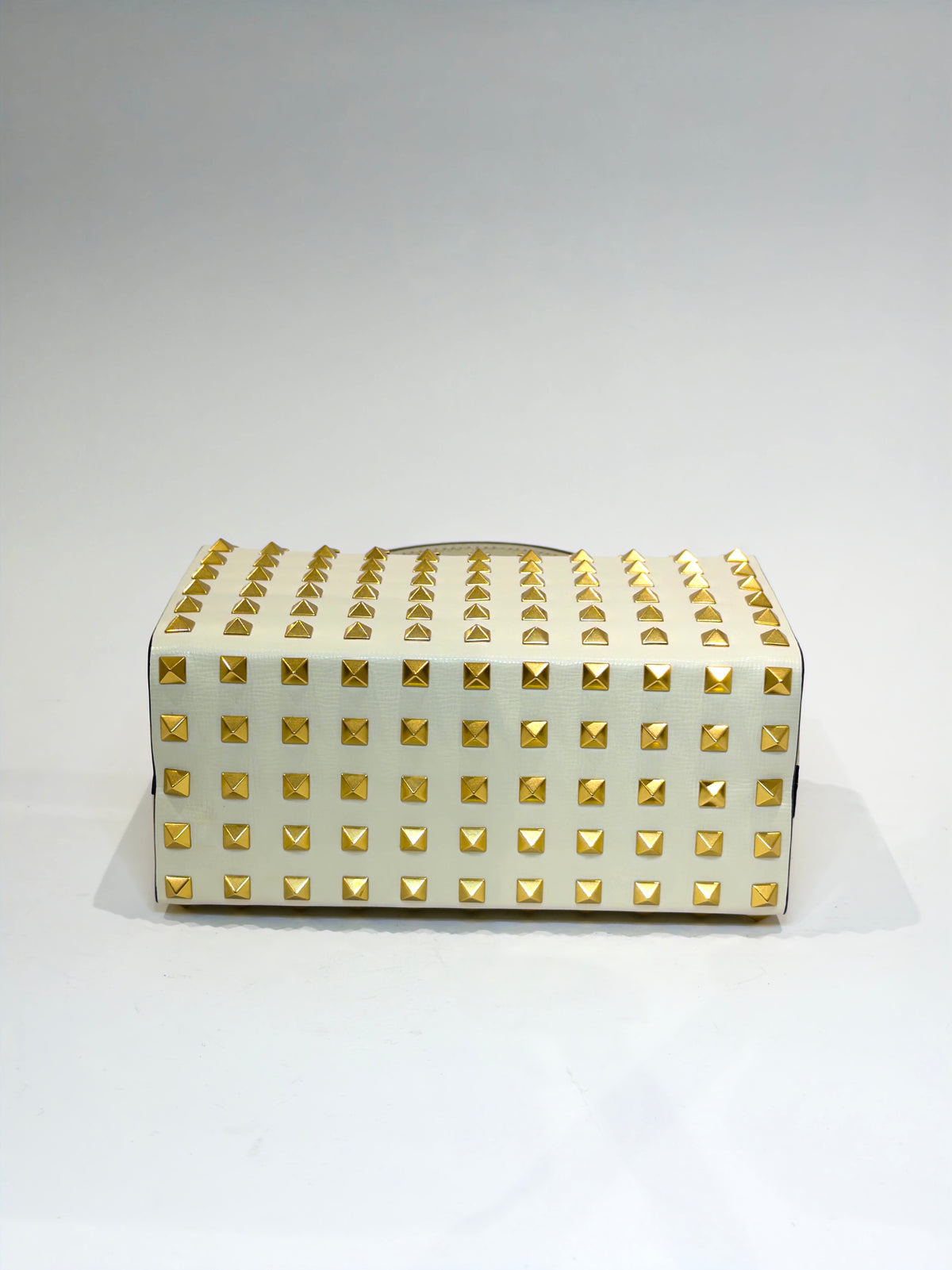 Structured ivory leather bag with signature Rockstud, box silhouette, top handle, and detachable shoulder strap.