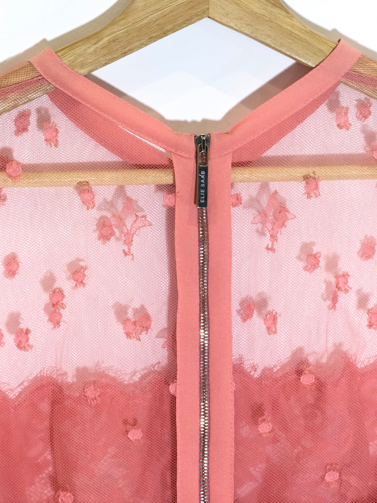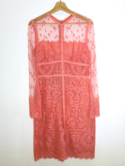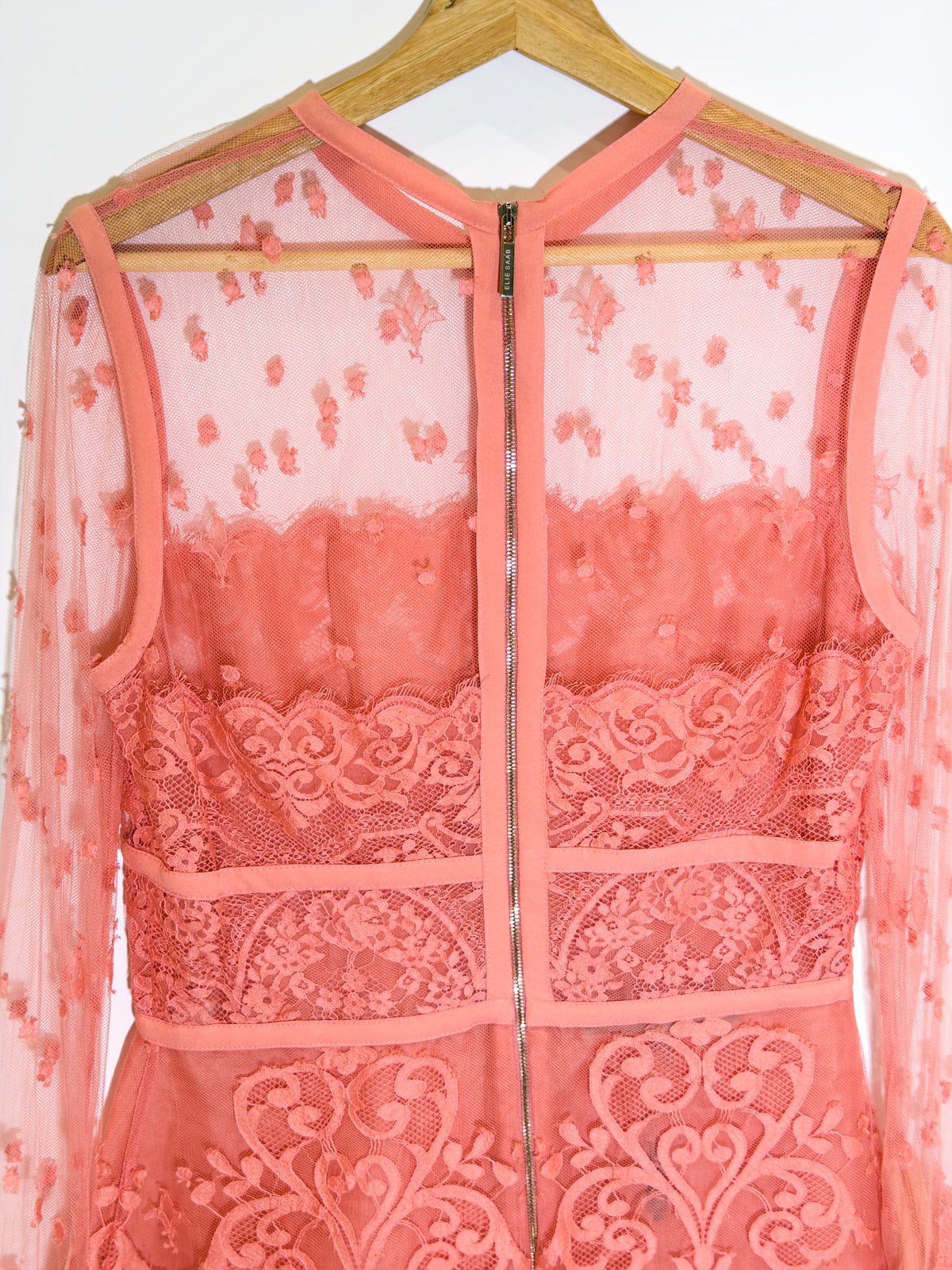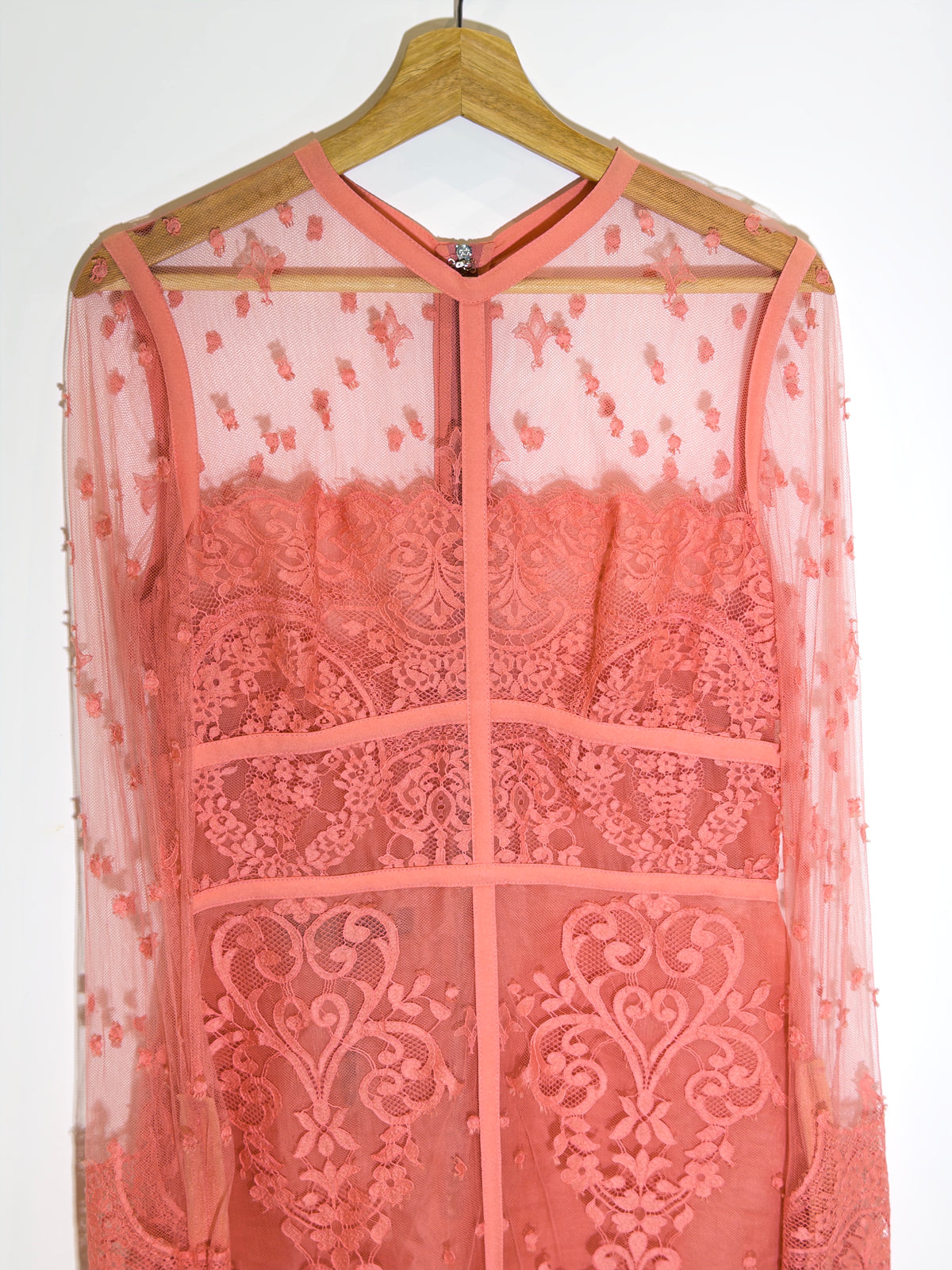 Peach-colored dress with a delicate lace ornamental pattern. Features a v-neckline, long sleeves, a back zipper closure, and a knee-length hem.