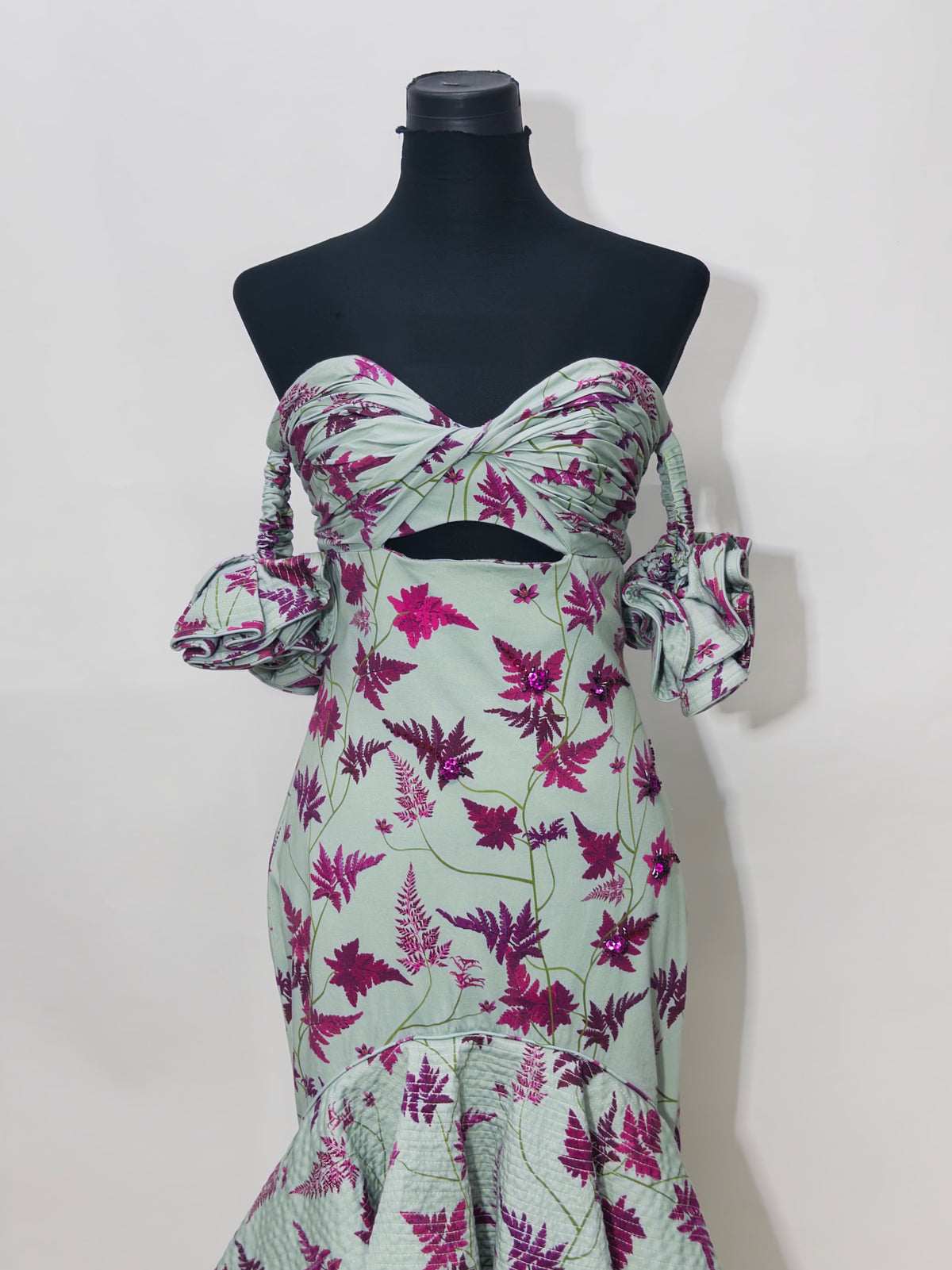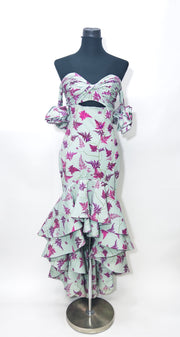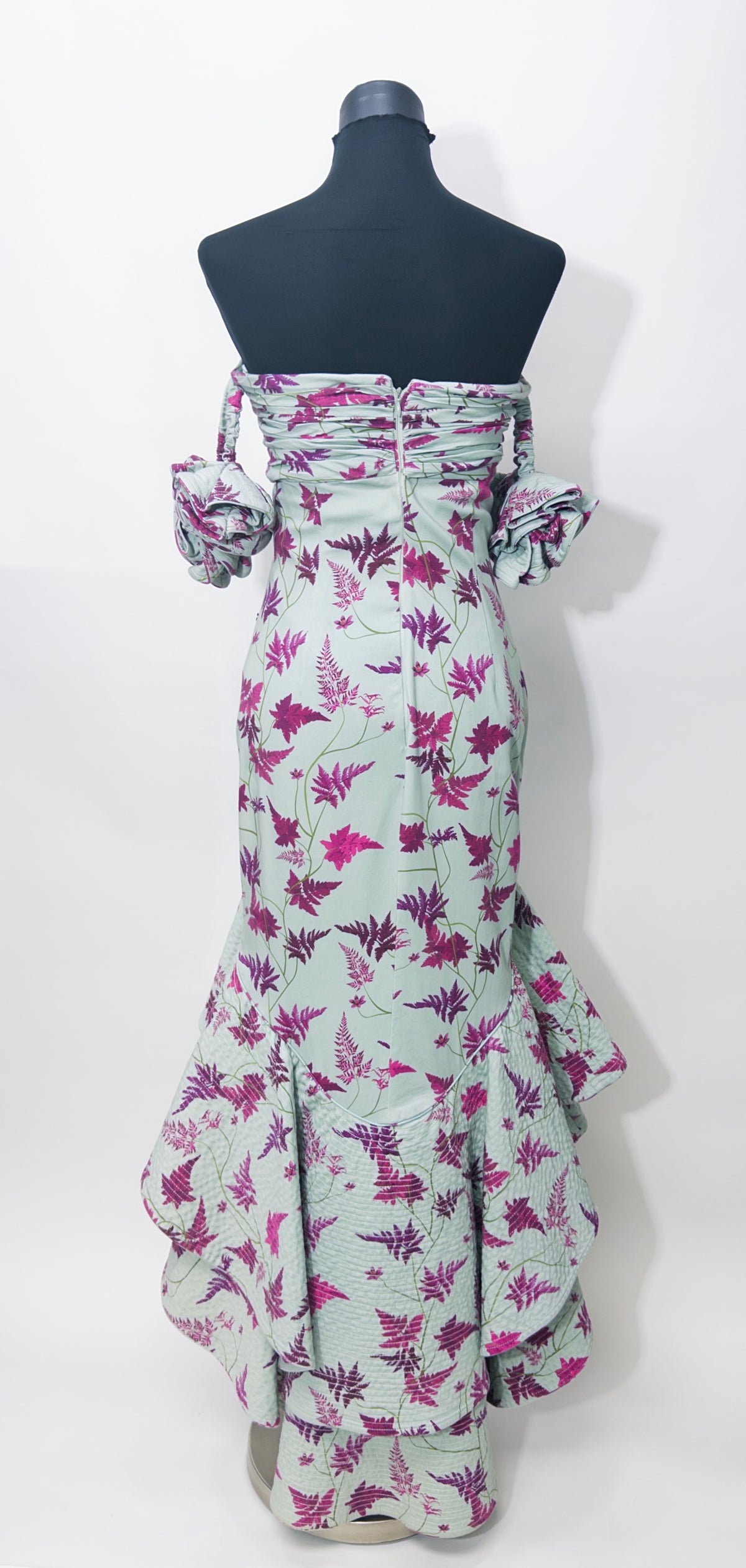 Off-shoulder long ruffled dress with arm cuffs detailing and mullet cut.