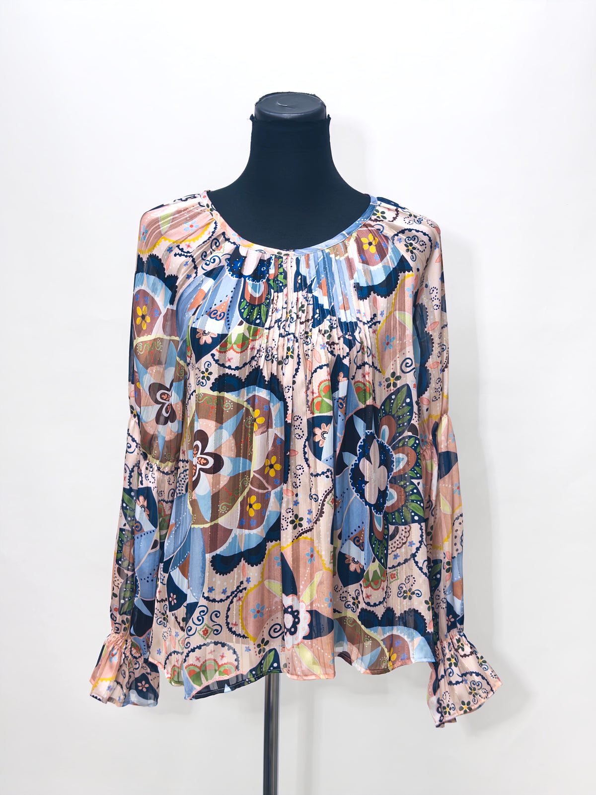 Multicolored long sleeve blouse in slightly sheer printed lurex.