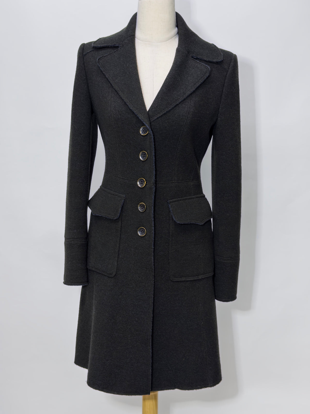 Cinched waist and "V" neck detailing green wool coat with six buttons-closure.