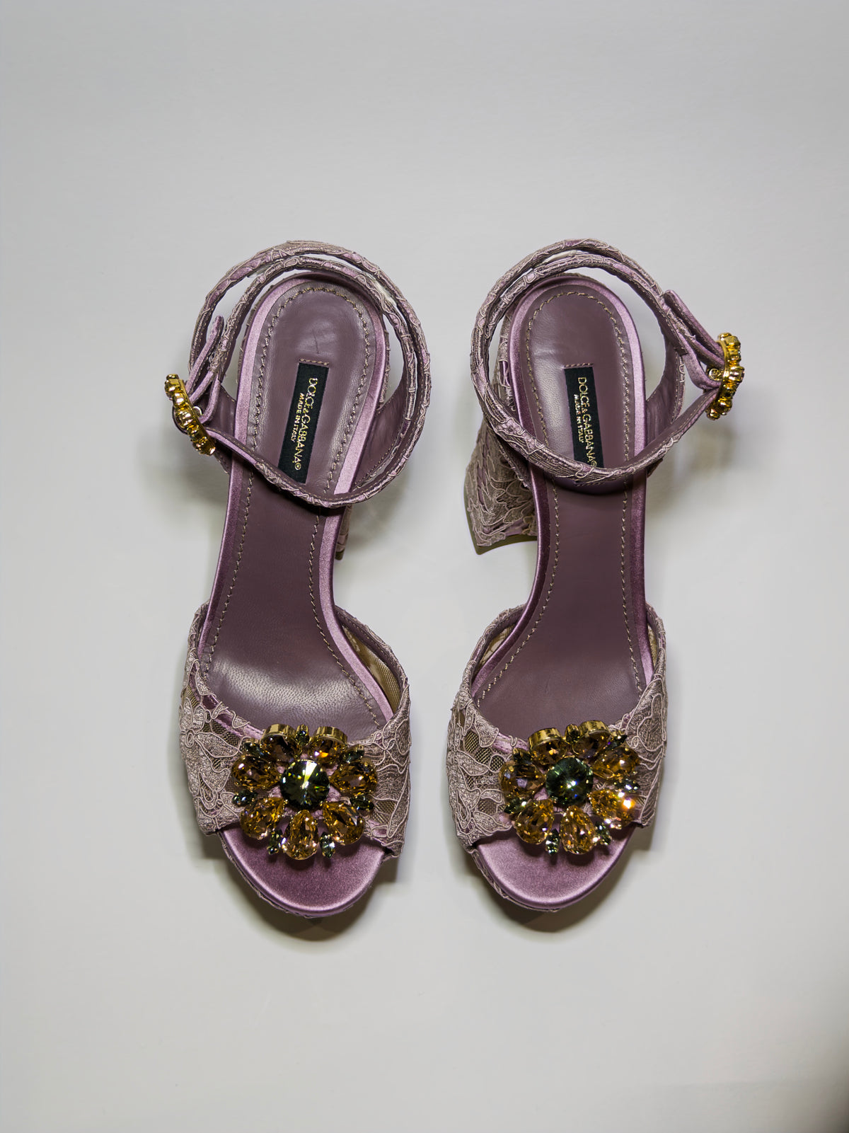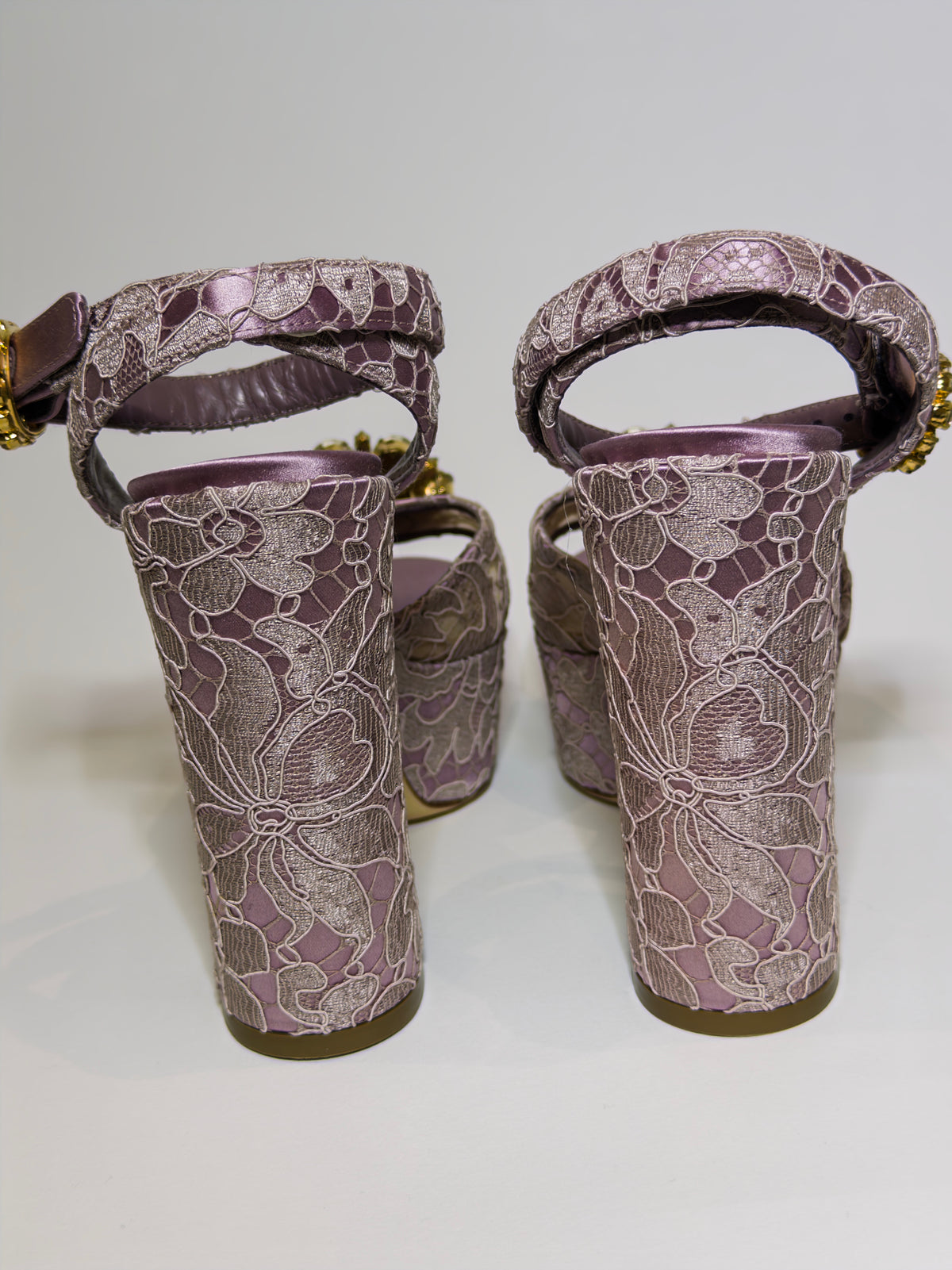 Purple lace platform sandals with crystal embellishments. Open-toe design with adjustable ankle straps and buckle closure.